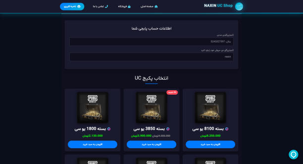 طراحی اختصاصی برای فروش محصولات درون برنامه ای بازی پرطرفدار پابجی برای فروشگاه معتبر ناکسین به صورت کاملا اختصاصی مطابق با درخواست مشتری انجام شده است. این وبسایت قابلیت دریافت اطلاعات اختصاصی اکانت از مشتری و تحویل فوری یوسی به مشتری ها میباشد